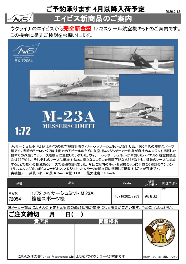 エイビス 新商品案内書 1/72 M.23A 2026.03.12