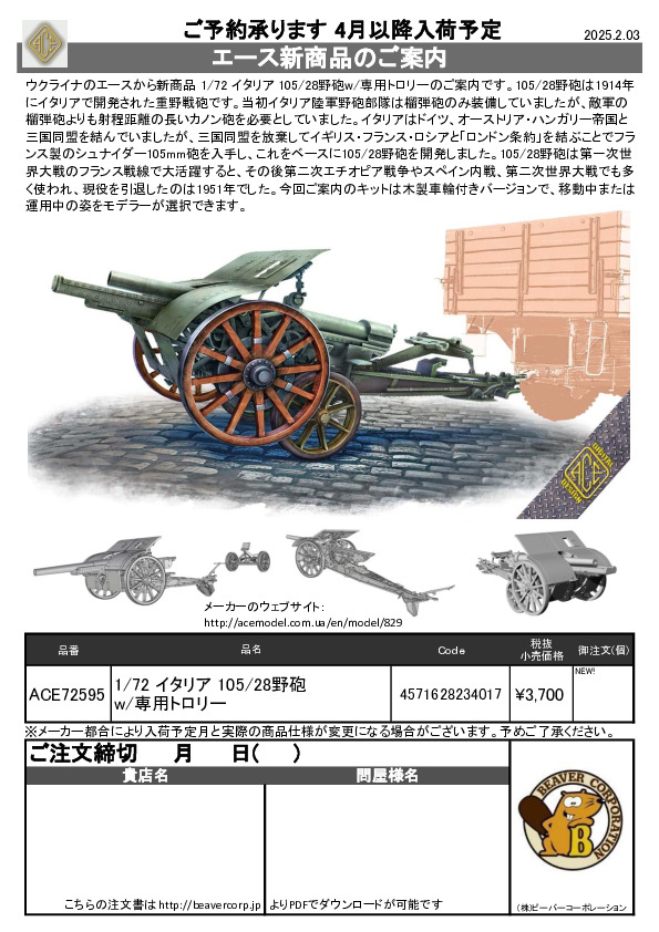 ACE 新商品 1/72 イタリア 105/28野砲ご案内 2025.02.03
