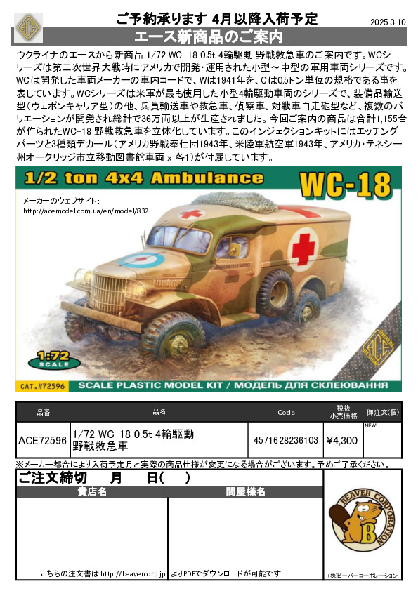 ACE 新商品 1/72 WC-18 0.5t 4輪駆動野戦救急車 ご案内 2025.03.10