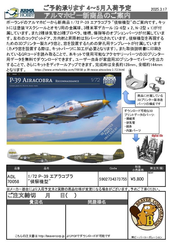 アルマホビー 1/72 P-39 偵察機型 新商品ご案内 2025.03.17
