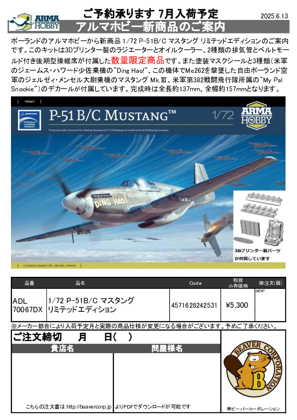 アルマホビー 新商品ご案内 1/72 P-51B/C マスタング 2025.06.13