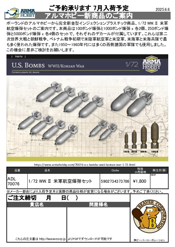 アルマホビー 新商品ご案内 1/72 WW.Ⅱ 米軍航空爆弾セット 2025.06.13