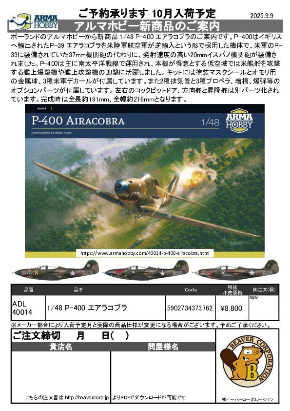 アルマホビー 1/48 P-400 エアラコブラ 新商品ご案内 2025.09.09