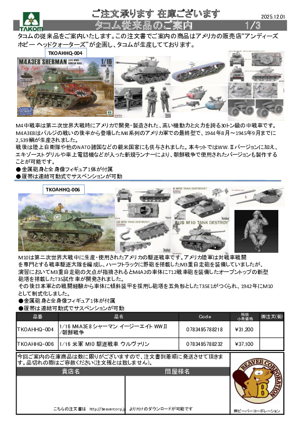 タコム/アンディーズホビー 新製品 1/16 M10 シリーズ 2点 注文書 2023.08.29