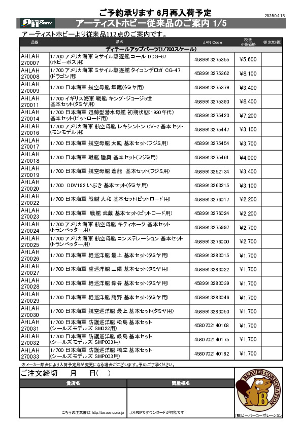 アーティストホビー 再入荷従来品案内 2025.04.18