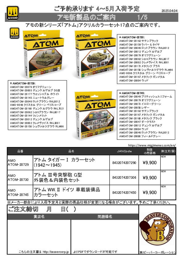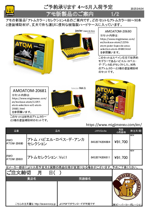 アモ 新製品 アトムカラーセット 注文書 2025.04.04