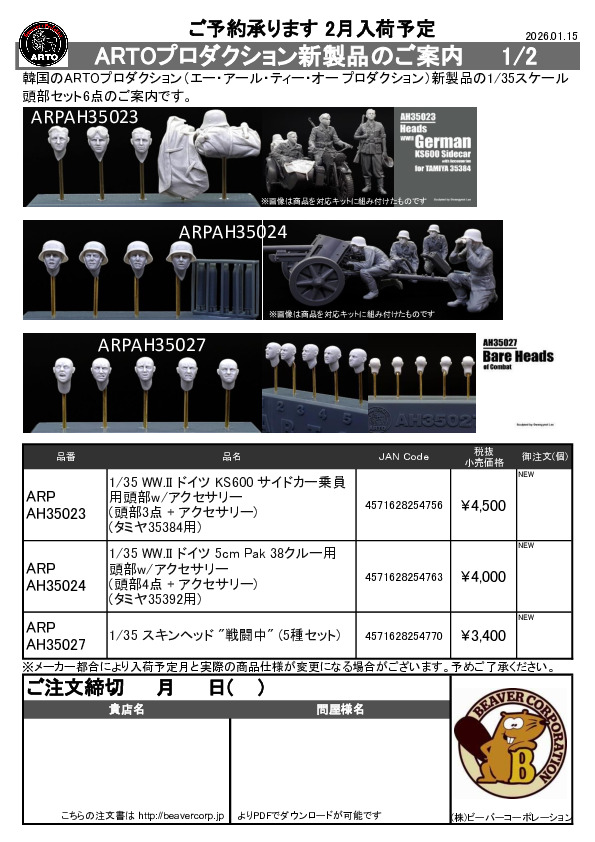 ARTOプロダクション 新製品 ヘッド注文書 2026.01.15