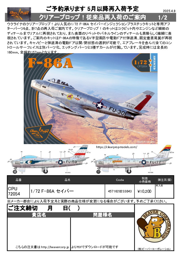クリアープロップ 1/72nd F-86A再入荷ご案内 2025.04.09