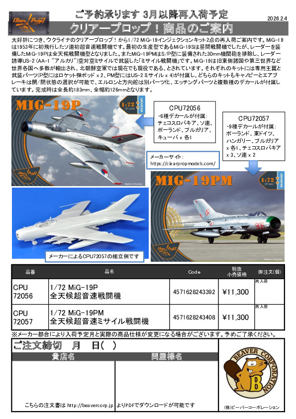 クリアープロップ 1/72 MiG-19再入荷ご案内 2026.02.04