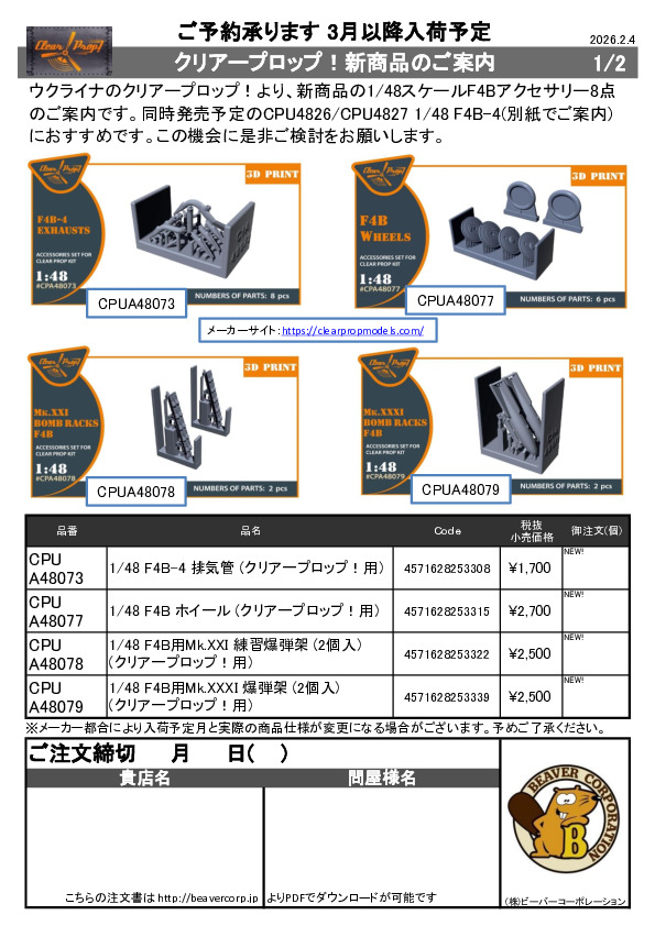 クリアープロップ 新商品 1/48 F4Bアクセサリーご案内 2026.02.04