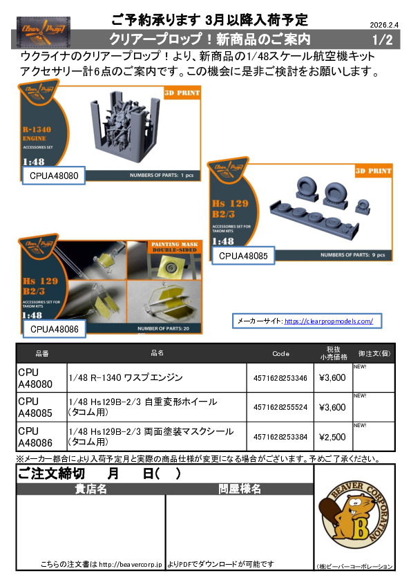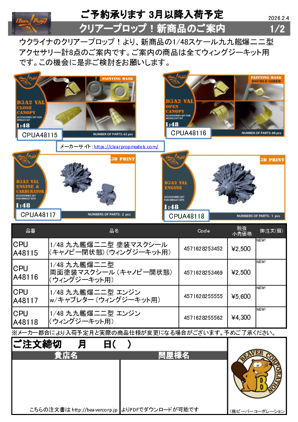 クリアープロップ 新商品 1/48 九九艦爆アクセサリーご案内 2026.02.04