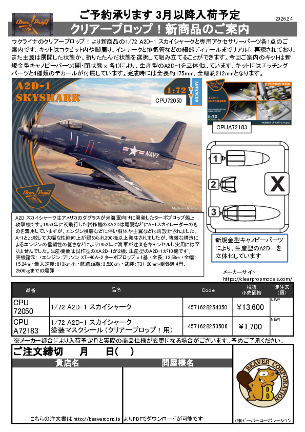 クリアープロップ 新商品 1/72nd A2D-1 ご案内 2026.02.04