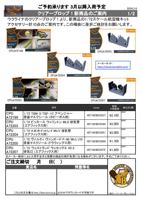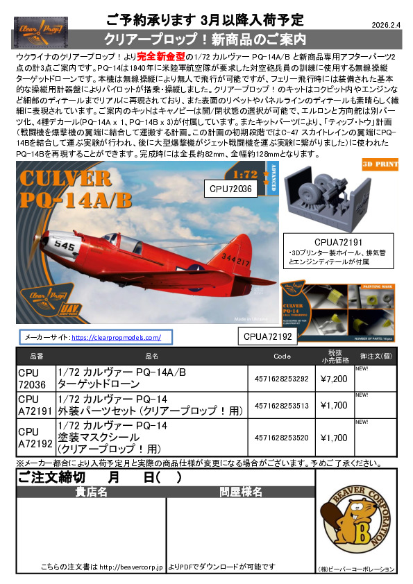 クリアープロップ 新商品 1/72nd PQ-14ご案内 2026.02.04