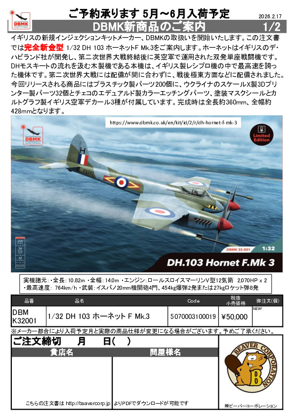 DBMK新商品ご案内 1/32 DH 103 ホーネット F Mk.3 2026.02.17