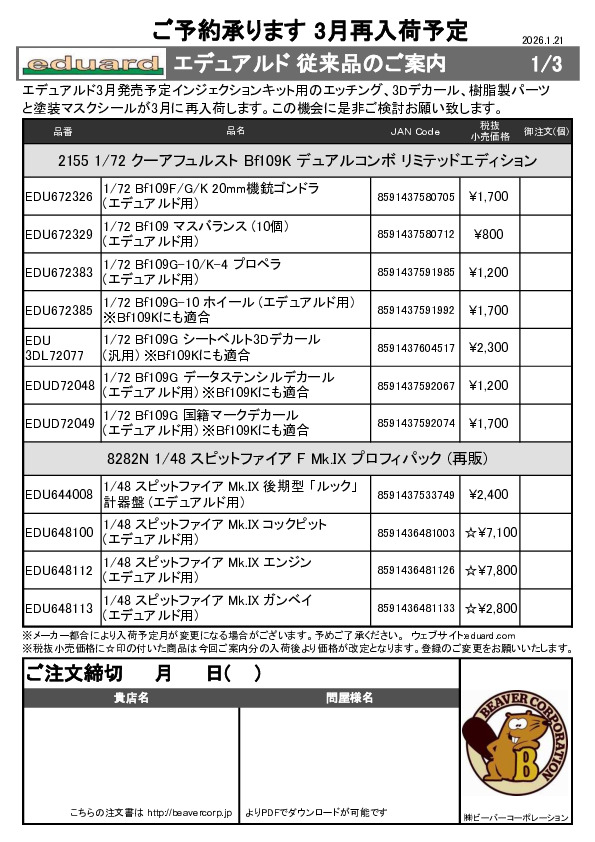 エデュアルド 3月用再入荷従来品ご案内 2026.01.21