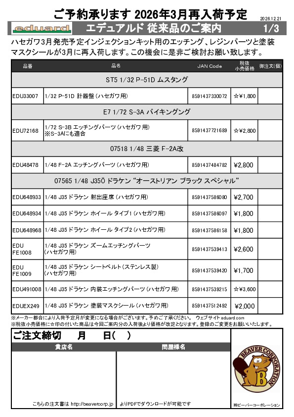 エデュアルド 3月入荷予定新製品のご案内 2026.01.19