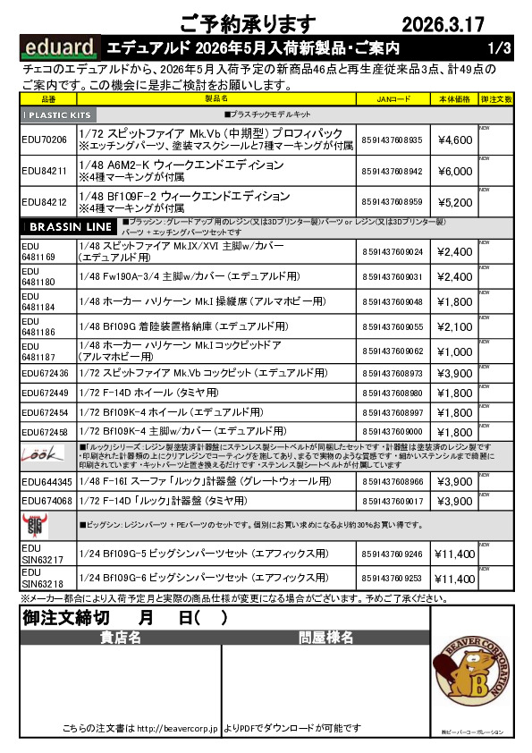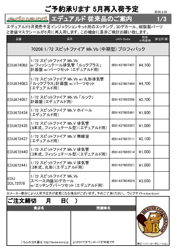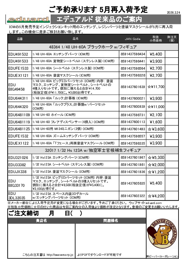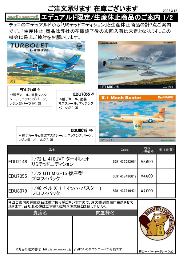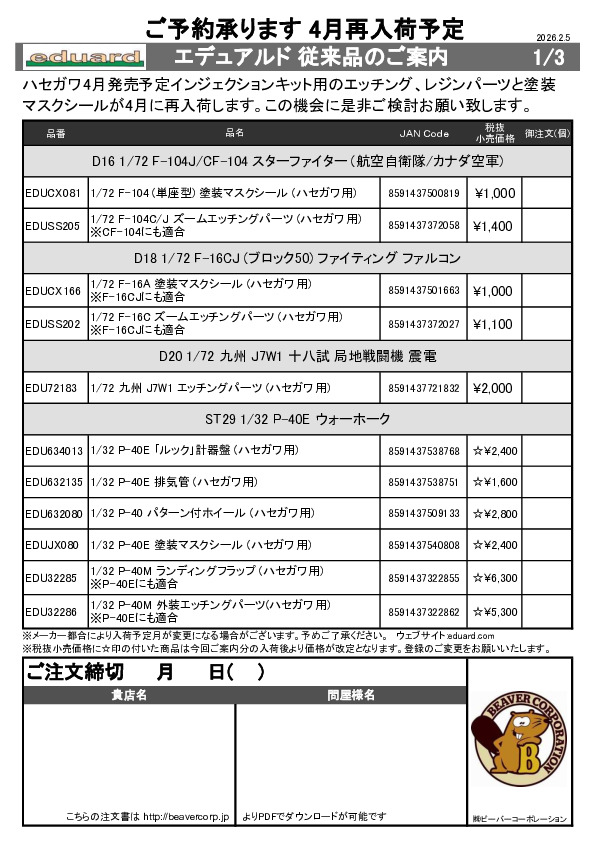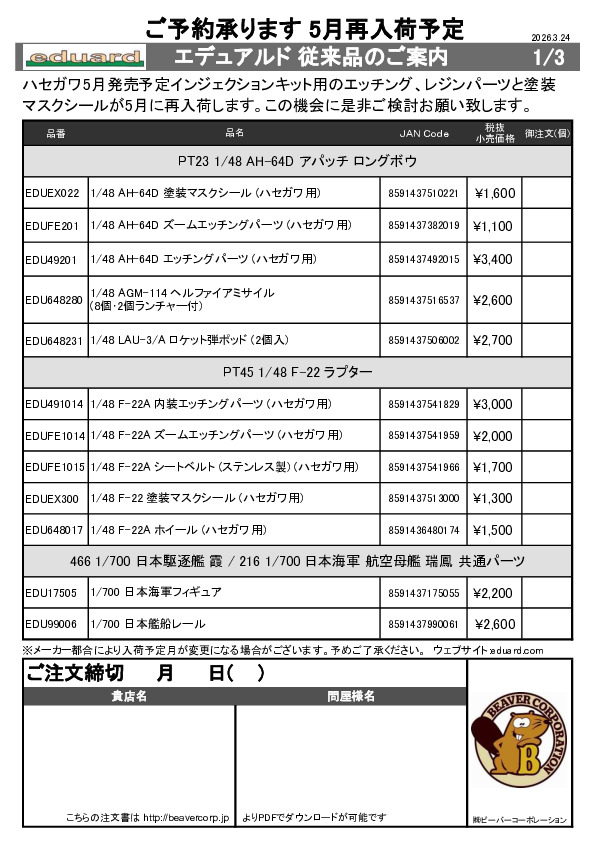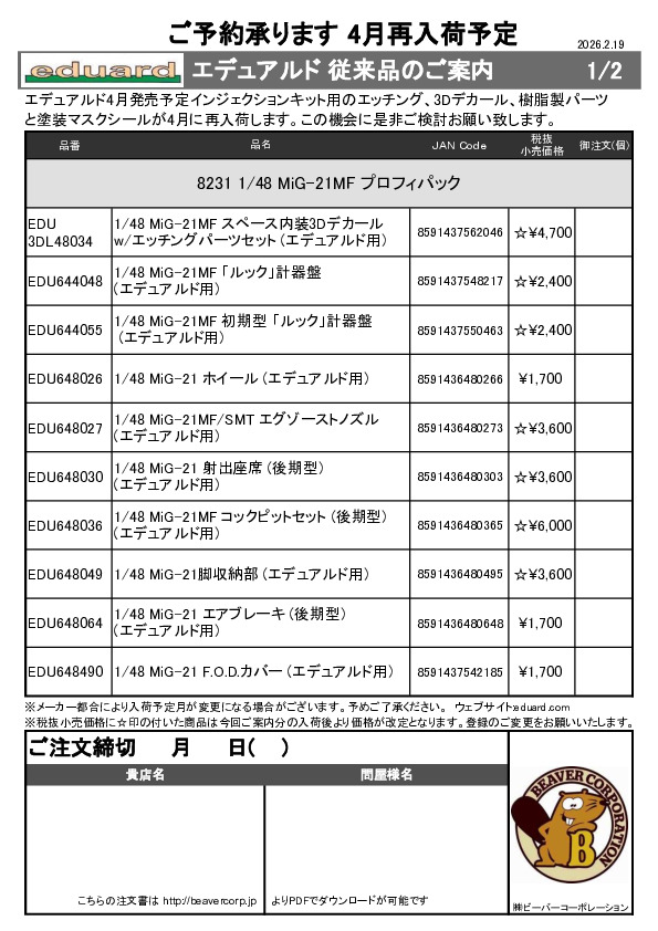 エデュアルド 4月製品用再入荷従来品ご案内 2026.02.19