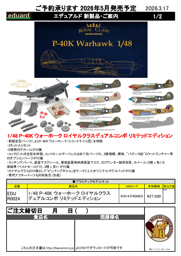 エデュアルド ロイヤルクラス 1/48 P-40K 新商品ご案内 2026.03.17