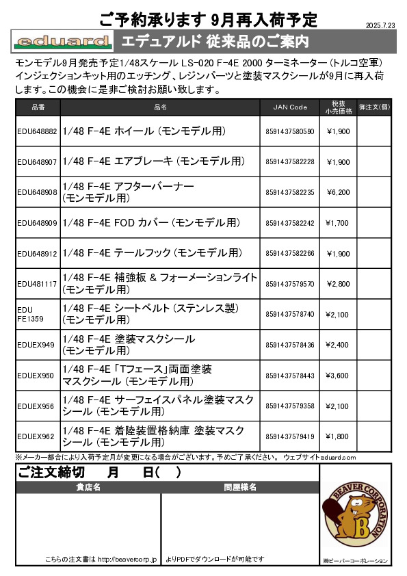 エデュアルド モンモデル用 9月再入荷従来品ご案内 2025.07.23