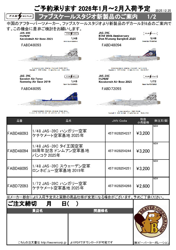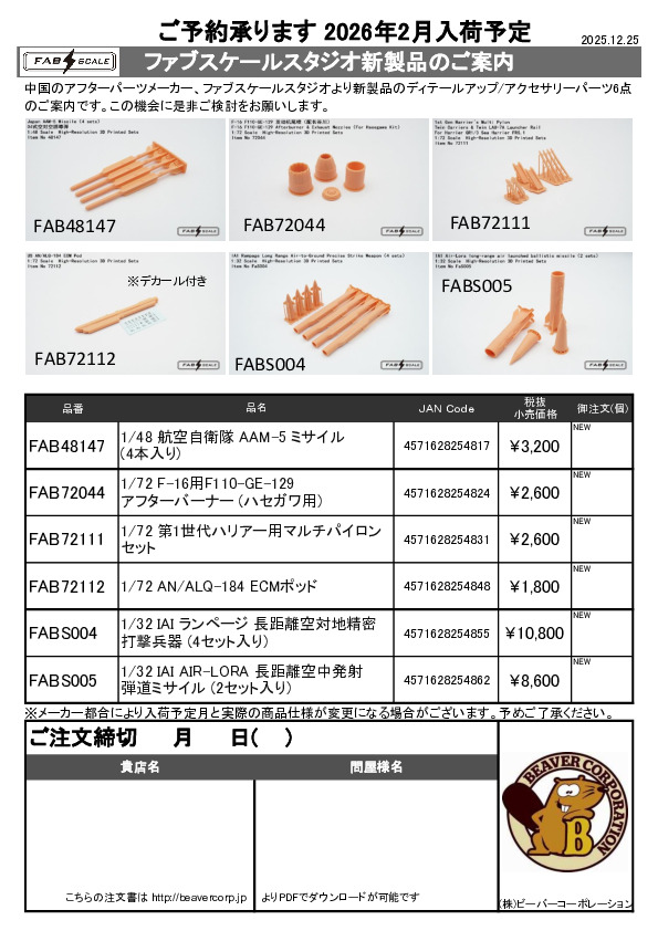 ファブスケールスタジオ 新製品 デカール8アイテム 注文書 2025.12.25