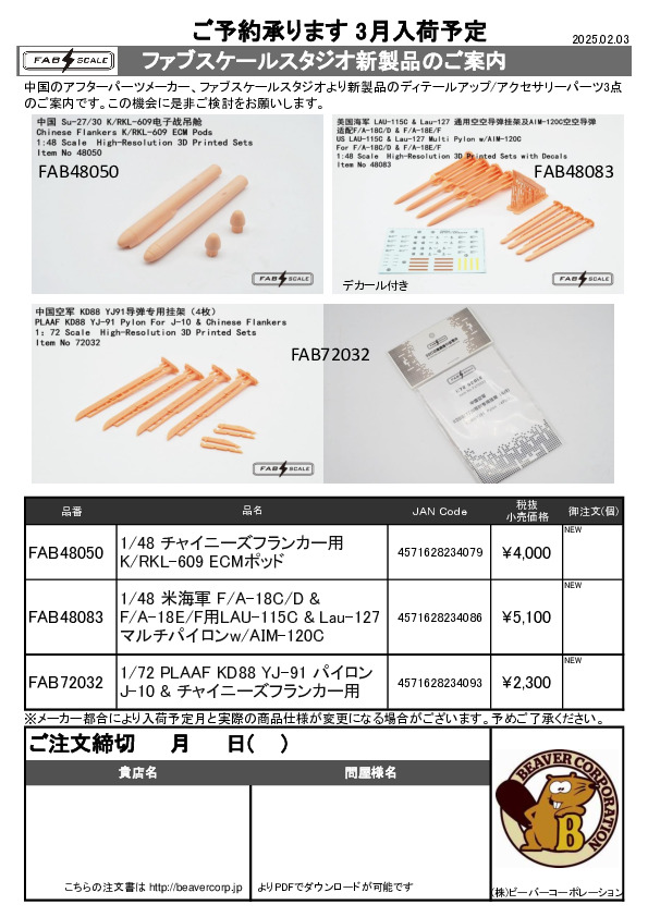 ファブスケールスタジオ 新製品 1/48 21アイテム 注文書 2024.12.03