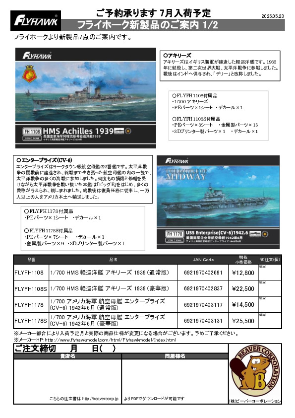 フライホーク 新製品案内 1/700 デュークオブヨーク 2025.05