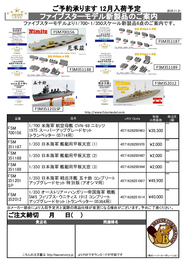 ファイブスターモデル 1/350スケール新製品注文書 2025.06.10