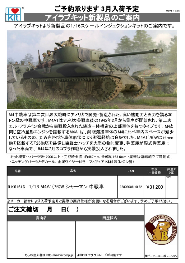 アイラブキット 新製品 1/16 M4A1 76W VVSS 注文書 2025.02.03