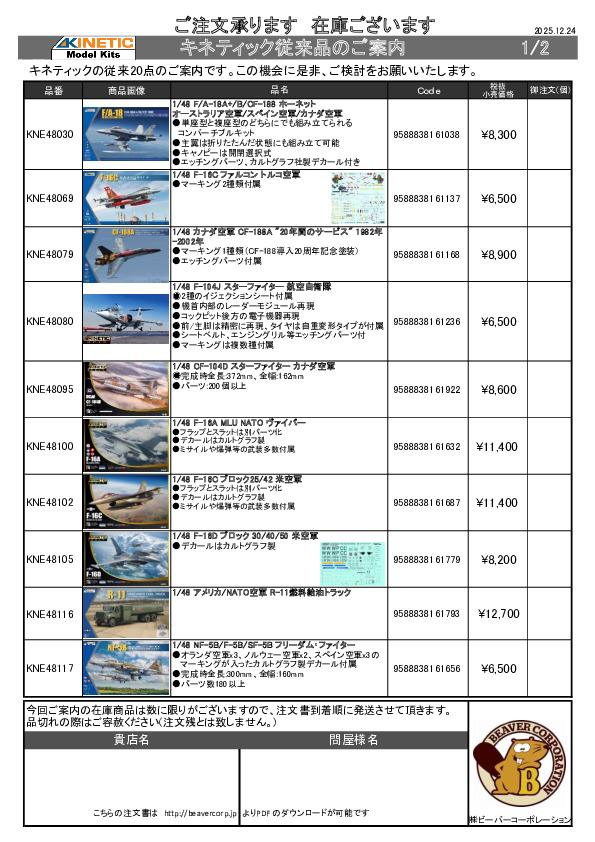 キネティック 1/48 FA-18 & MiG-17F 新製品注文書 2025.06.10