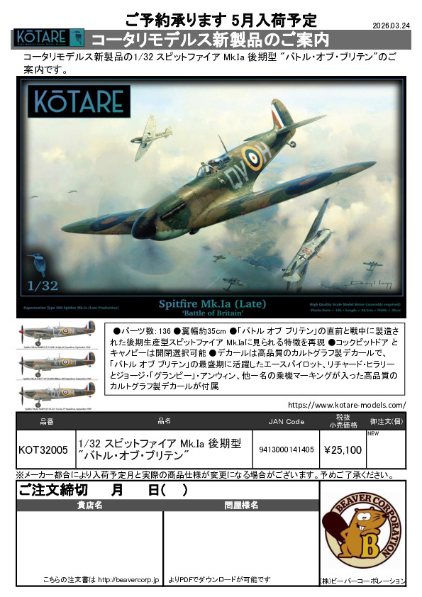 コータリモデルス 新製品注文書 1/32 スピットファイア Mk.Ia 後期型 バトル オブ ブリテン 2026.03.24