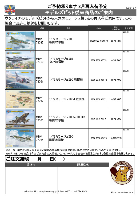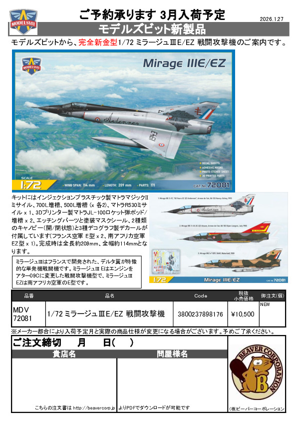 モデルズビット 新製品 1/72 ミラージュⅢ のご案内 2026.01.27