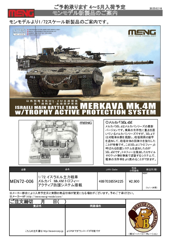 MENG 新製品案内 1/72メルカバ Mk.4M トロフィー 2025.02.18