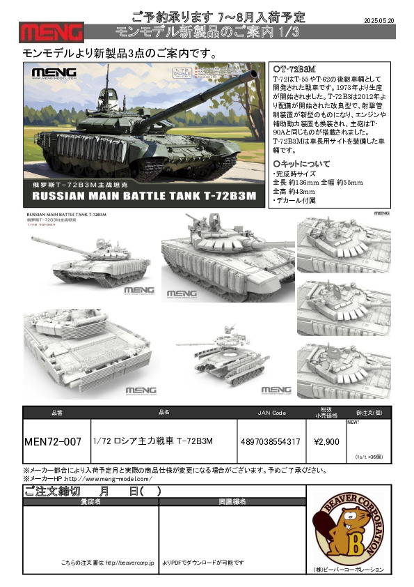 MENG 新製品案内 T-72B3M, ZX-10R, J-20 2025.05.20
