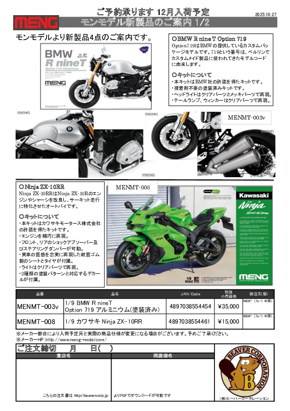 MENG新製品案内 1/9 バイク & パーツ 4点 2025.10.27