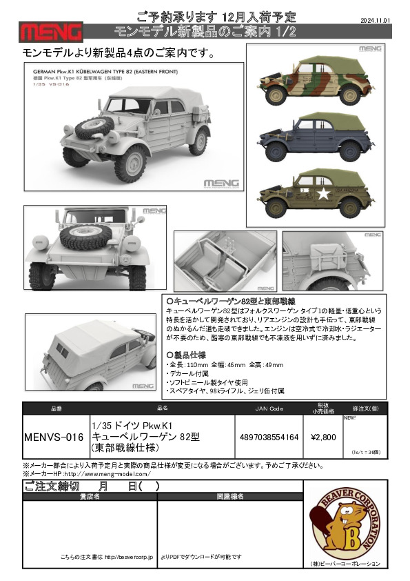 MENG 新製品 1/35 Type 82 Kubelwagen 2024.08.06
