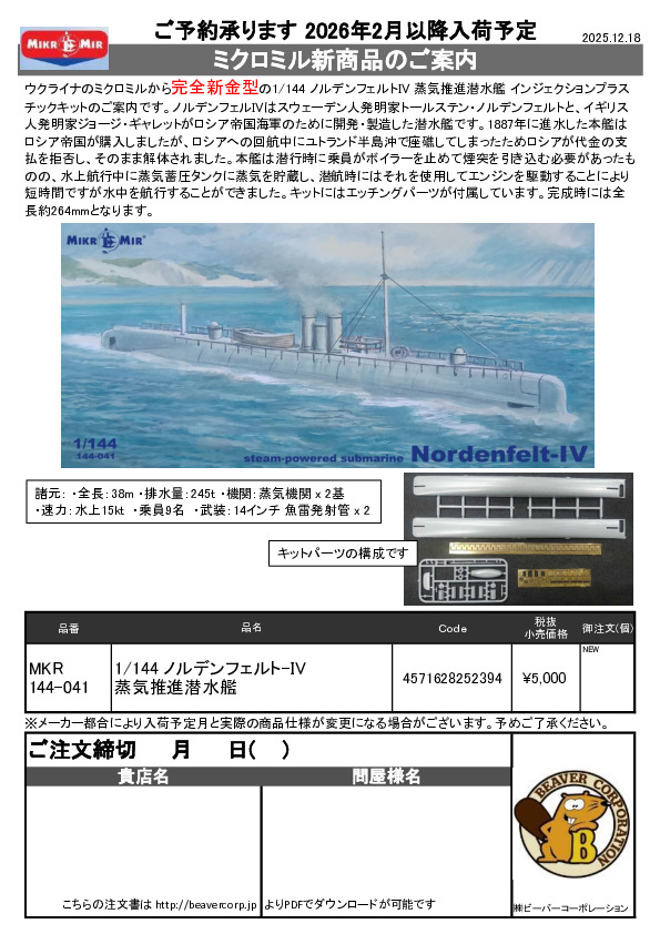 ミクロミル 新商品 ノルデンフェルト 潜水艦 ご案内 2025.11.06