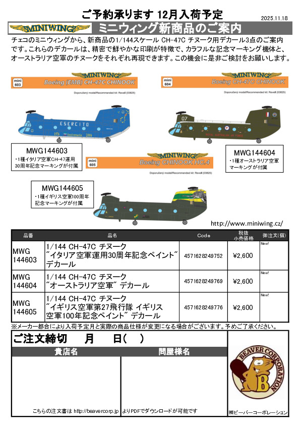ミニウィング 新商品ご案内書 1/72 CH-47C用デカール 2025.07.18