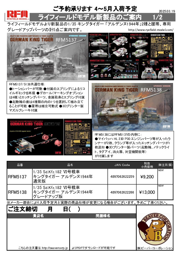 ライフィールドモデル 新製品 1/35 キングタイガー アルデンヌ 1944年 注文書 2025.03.19