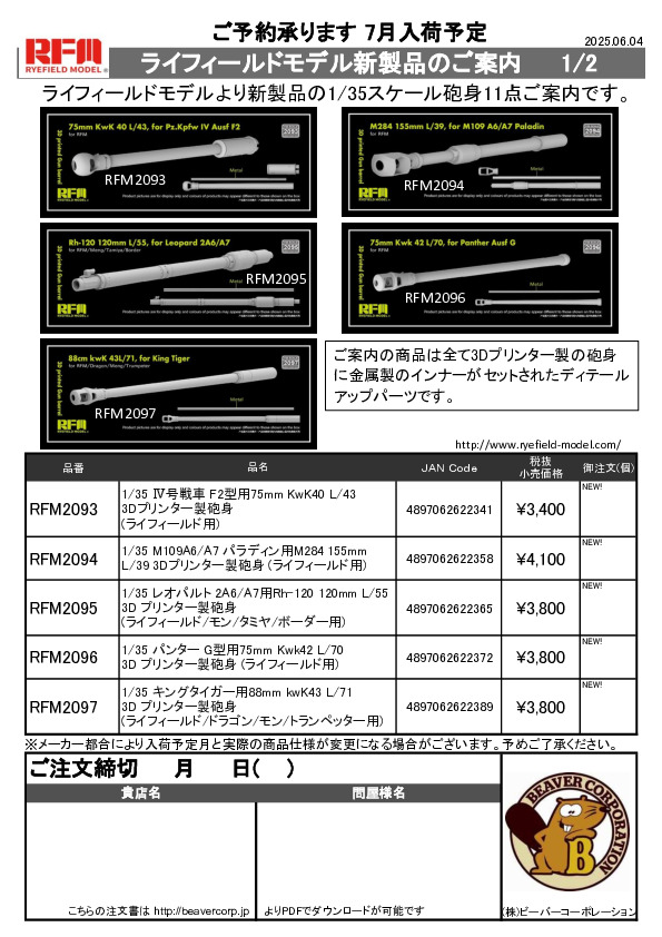 ライフィールドモデル 新製品1/35 3Dプリント製砲身注文書 2025.06.04