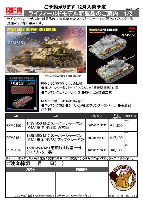 ライフィールドモデル 新製品 1/35 M50 Mk2 スーパーシャーマン 注文書 2025.11.20
