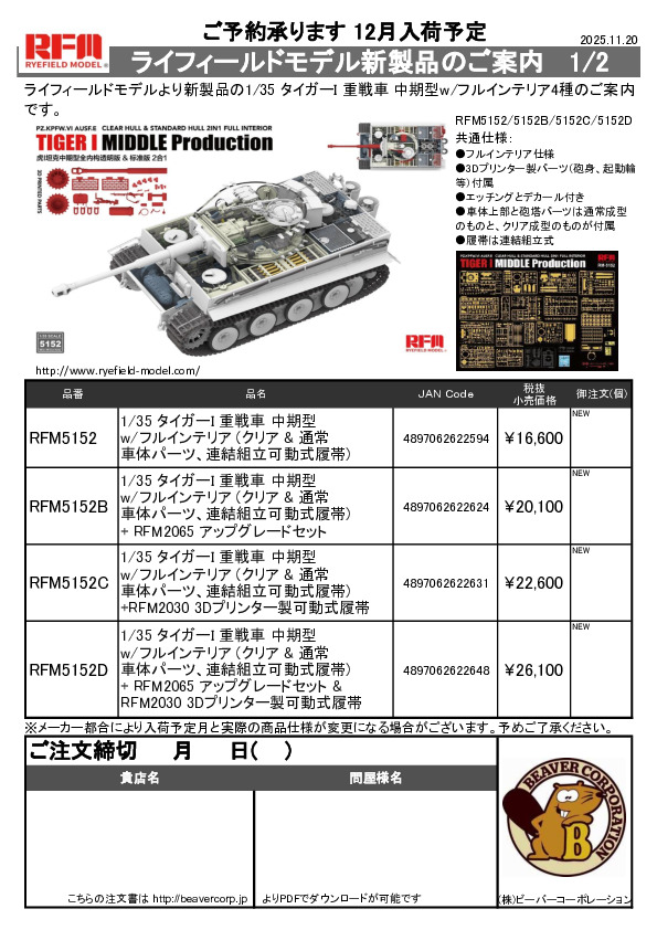 ライフィールドモデル 新製品 1/35 タイガーI 中期注文書 2025.11.20