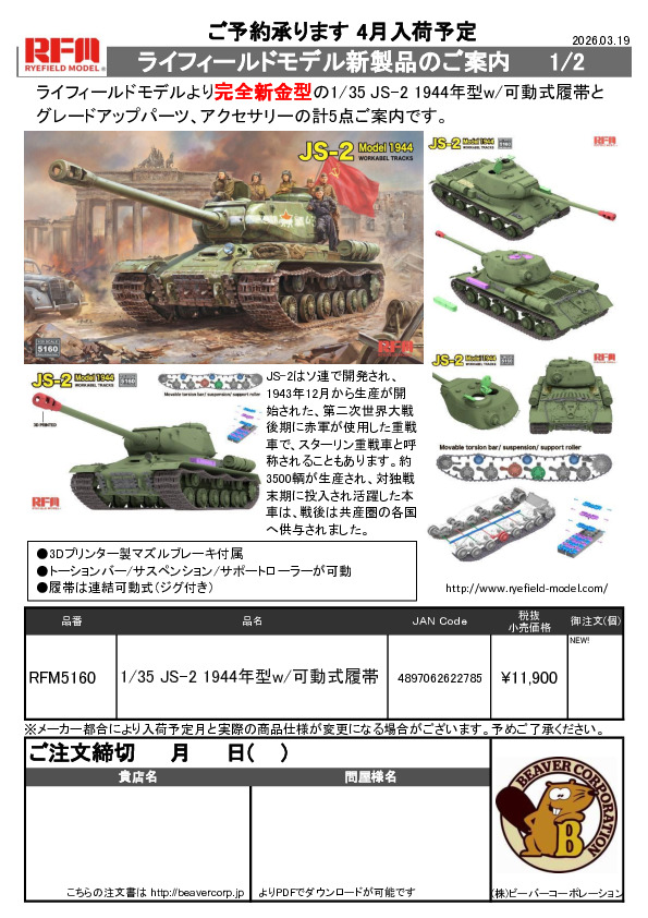 ライフィールドモデル 新製品 1/35 JS-2 1944年型 & パーツ 注文書 2026.03.19