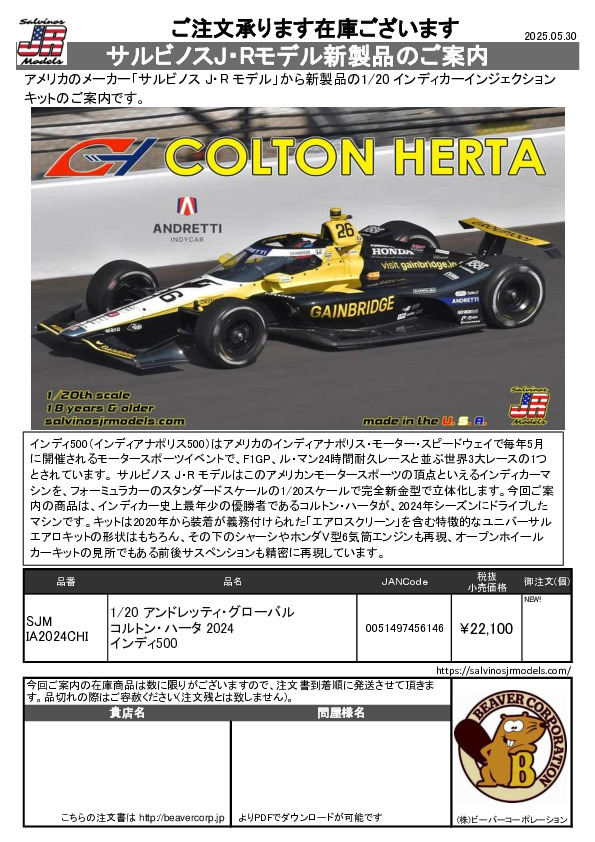 サルビノスJRモデル 新製品 アンドレッティレーシング インディカー 注文書 2025.05.30