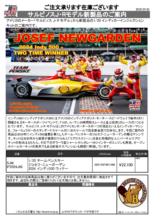 サルビノスJRモデル 新製品 チームペンスキー インディカー 注文書 2025.05.30