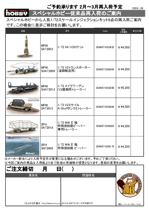 スペシャルホビー ミリタリー 再入荷従来品ご案内 2026.01.26