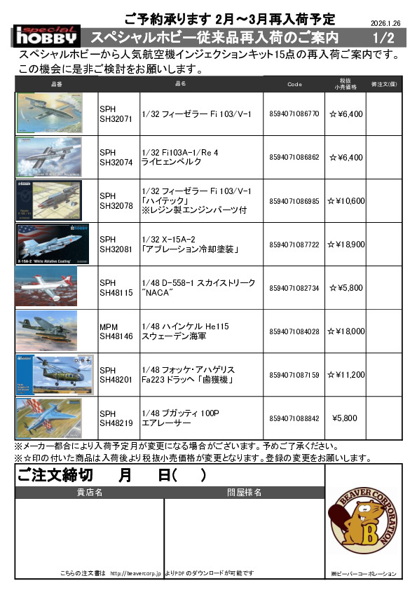 スペシャルホビー 航空機再入荷従来品ご案内 2026.01.26