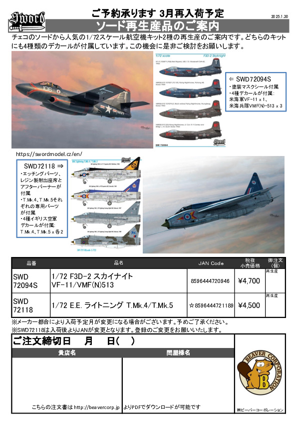 ソード 再生産品ご案内 1/72 F2H バンシー 2点 2024.02.05