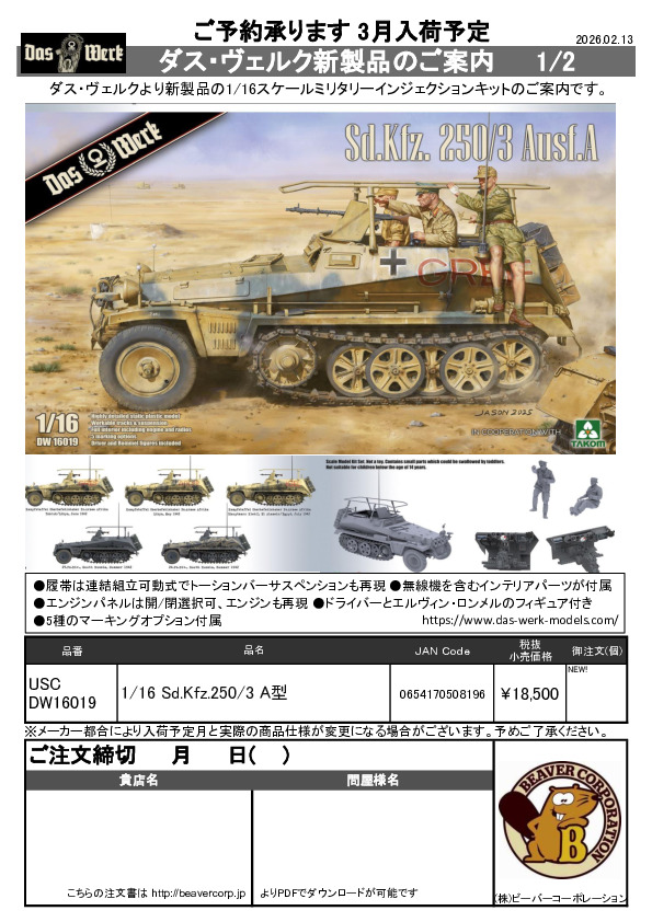 ダス ヴェルク 新製品 1/16 Sd.Kfz.250/3 A型 注文書 2026.02.13