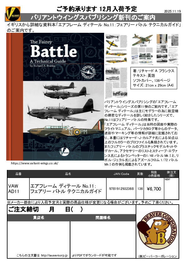 バリアントウィングス 新刊 エアフレームディテール11 フェアリー バトル 注文書 2025.11.19
