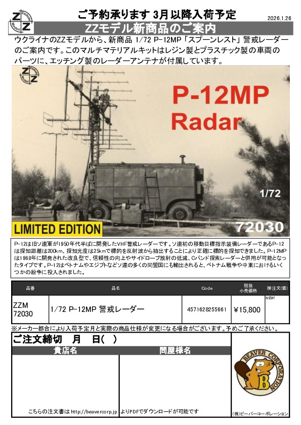 ZZモデル 新商品ご案内 1/72 P12MP Radar 2026.01.26